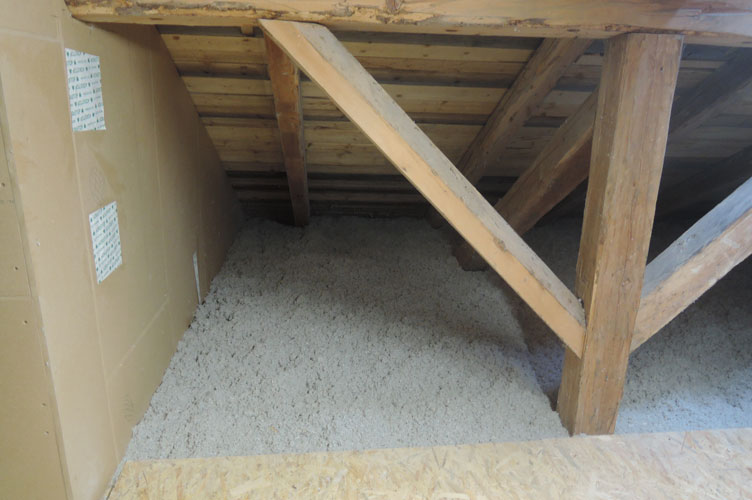 Im Zuge der Sanierung kam im Erdgeschoß der Dämmstoff Hanf zum Einsatz - im OG Zellulose zwischen Stegträgern und eine Holzschalung. Der nicht unterkellerte Teil des Hauses wurde mit Schaumglasschotter (Boden) gedämmt. Weitere Maßnahmen bilden die Dachbodendämmung - 40 cm Zellulose wurden dort aufgeblasen. Neue Holzfenster sowie die Neugestaltung des Badezimmers runden das Gesamt-Konzept ab. Der Einbau einer kontrollierten Wohnraumlüftung (mit Einzelgeräten) sorgt für ein besonders angenehmes Raumklima. Die alte Ölheizung wurde durch einen Kachelofen ersetzt. Die Frostfreihaltung im Winter erfolgt durch Infrarotheizpaneele. Wenn das Ferienhaus im Winter bewohnt ist wird mit dem Kachelofen geheizt.